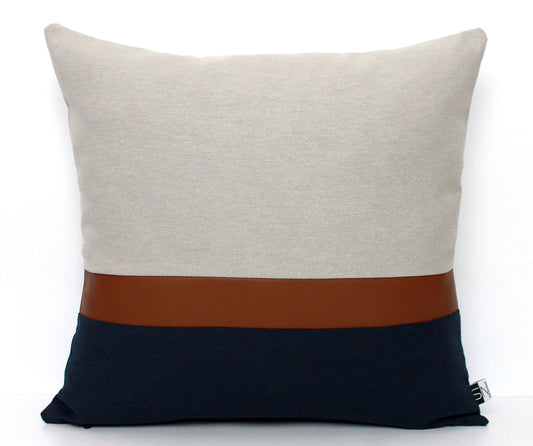 Light Grey, Navy Blue and Brown Faux Leather Colorblock Lumbar Pillow Cover - Custom Colors