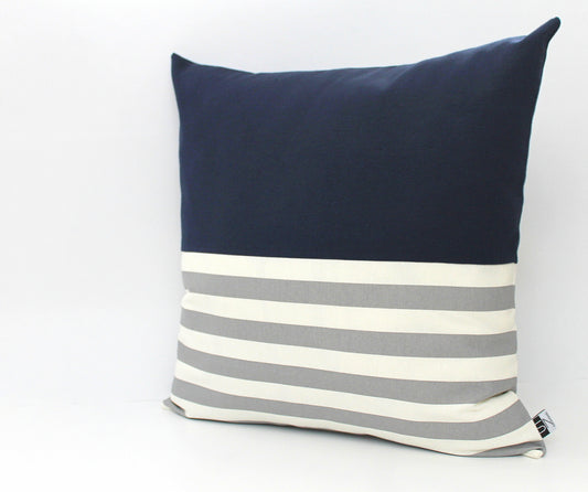 Navy Blue with Grey and White Stripes Colorblock Pillow Cover