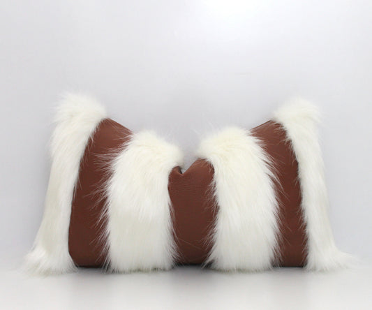 Cream and Brown Textured Faux Fur / Leather Pillow Cover